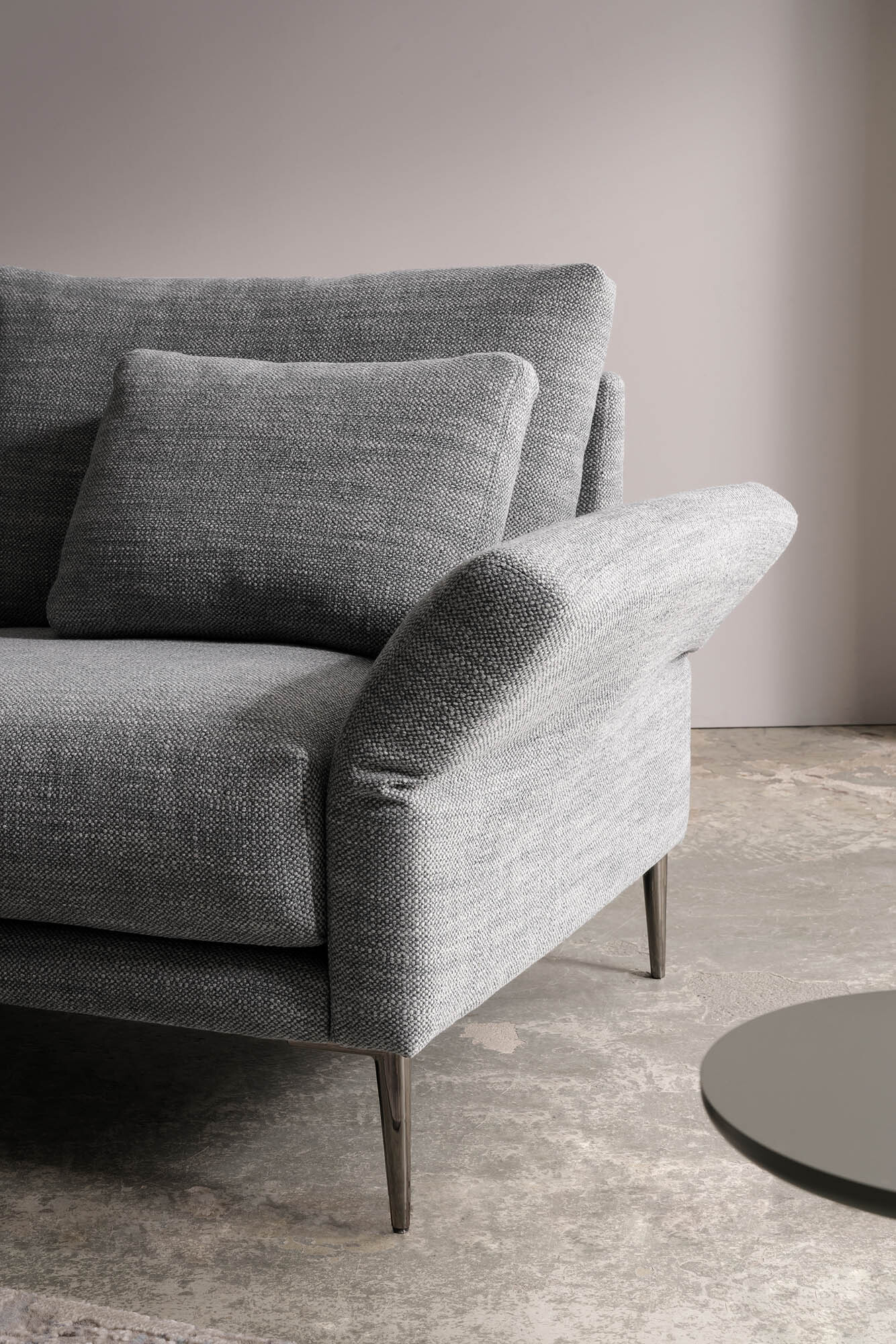 Stoff, Farbe graublau, Taschenfederkern, Rücken echt, Fuß schwarz chromiert, Sitzhöhe 43 cm, Sitztiefe 53 cm, bestehend aus: