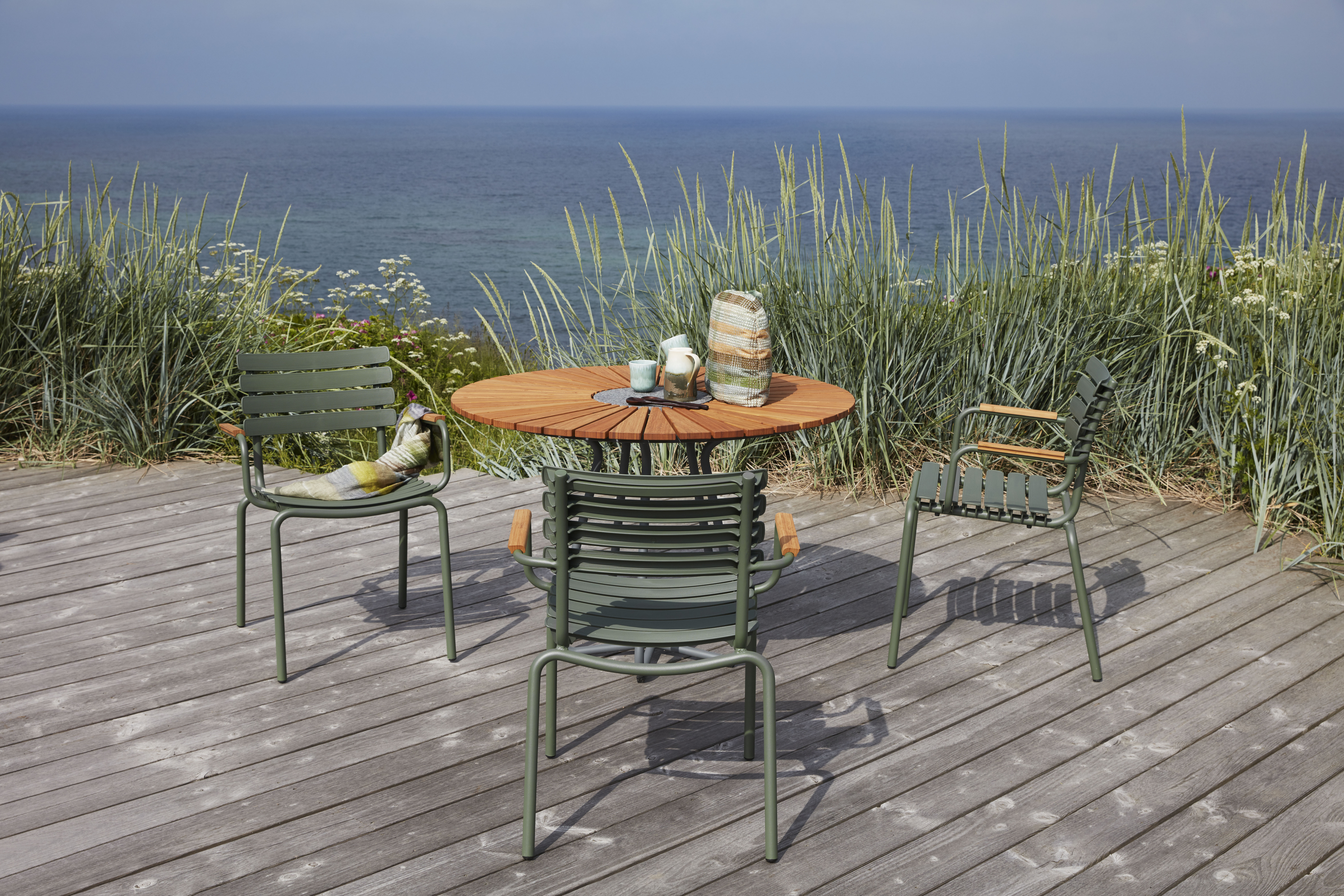 Der ReCLIPS-Esszimmerstuhl ist in drei einfarbigen Farben erhältlich und kann optional mit Armlehnen aus Bambus ausgestattet werden. Der Aluminiumrahmen in Kombination mit den UV-geschützten Kunststofflamellen hält den Wartungsaufwand auf ein Minimum.